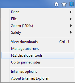 - Press F12 to launch the IE Developer Tools or find it on the Tools menu as shown below: